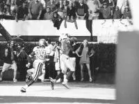 The defensive touchdown brought life to offensive coordinator Norm Chow’s squad and the battered Rivers, the freshman sensation at quarterback who endured seven sacks and two interceptions in the game, and the rest of the Wolfpack offense. On the Pack’s next possession, Rivers found himself – yet again – in the arms of a Georgia Tech defensive tackle, but muscled his way free and flipped the ball to Robinson. The talented receiver picked his way across the field and turned it into a 48-yard touchdown, tying the game at 13.