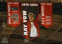The new banners feature a centerpiece that has a picture of Yow, with her years of service (1975-2009). A smaller one to the left highlights her induction into the Women's Basketball Hall of Fame in 2-2000 and the Naismith Memorial Basketball Hall Fame in 2002. A similar one to the right emphasizes Yow's 737 career wins, including the dates of her 500th, 600th and 700th victories.